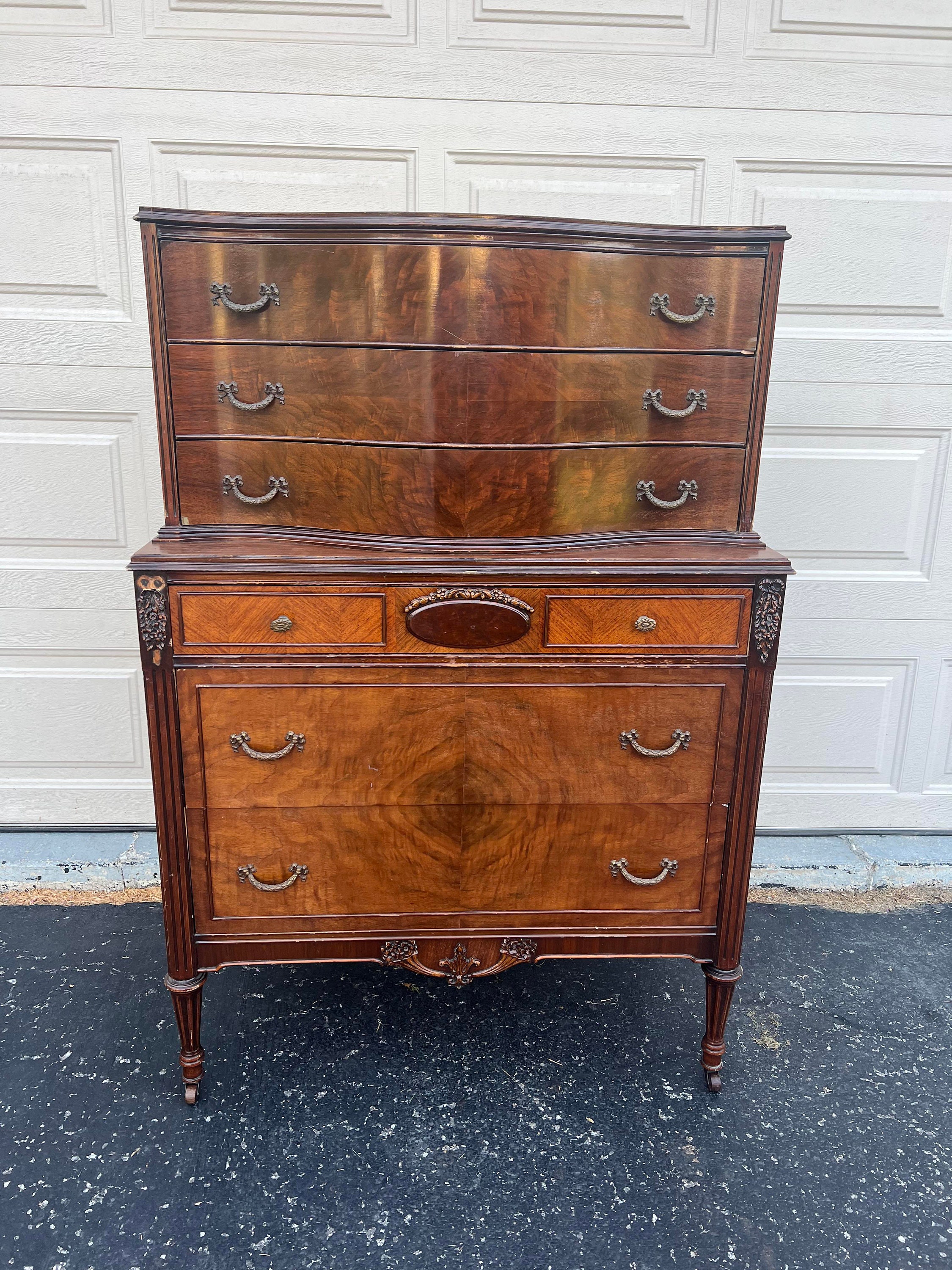 Tall boy MCM vintage dresser by Stanley with Burl wood in lay for sale